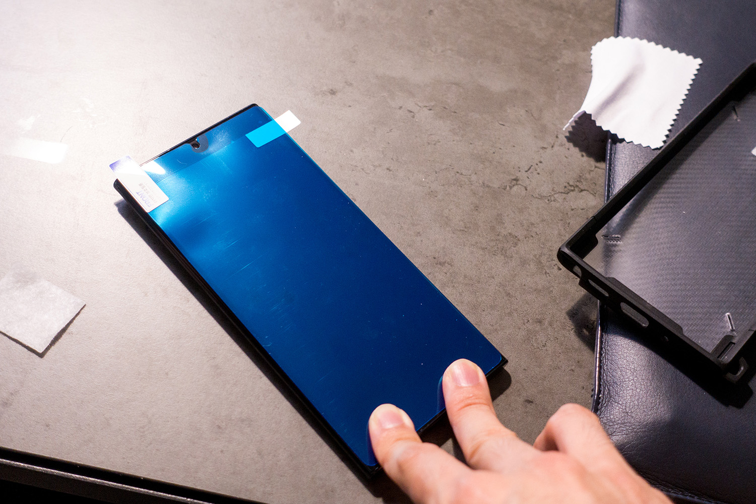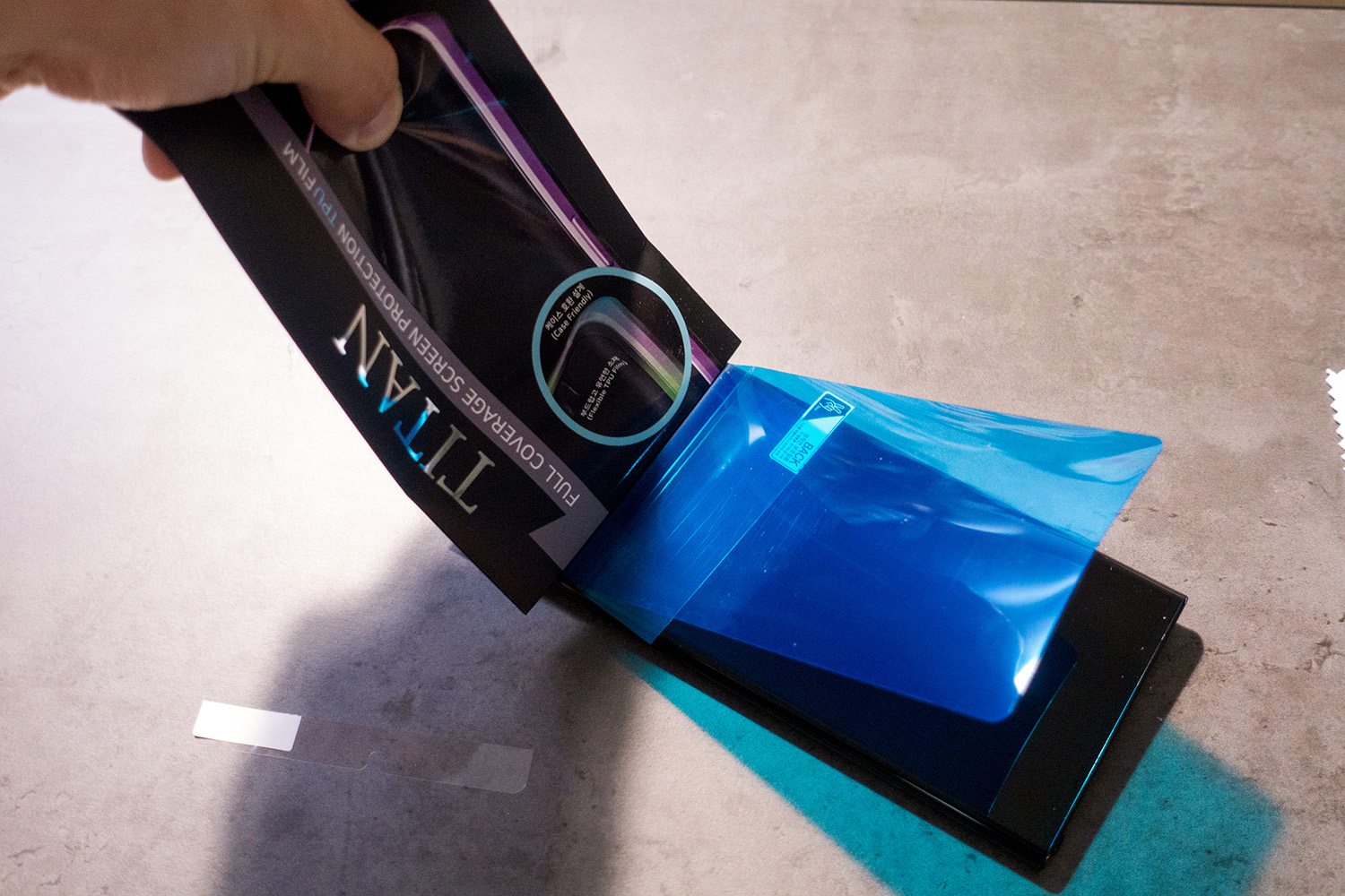 머리 부분을 짱짱하게 붙이고 나면 이렇게 단단한 종이 케이스로 쭉- 밀어주면 뒤쪽 보호필름이 밀려나오면서 엄청 짱짱하게 붙는다.