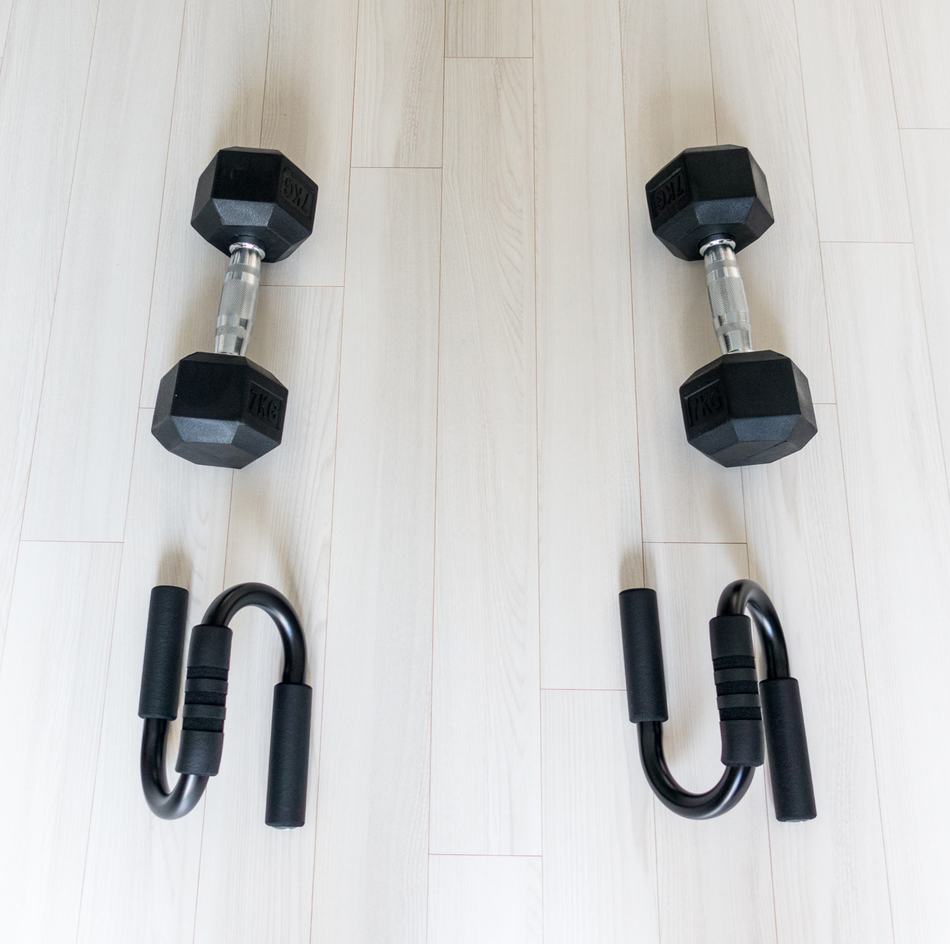 원래 위의 아령 푸쉬업바...(ㅠㅠ) 를 쓰고 있었는데 이게 맨 바닥에 하면 괜찮은데 운동하는 매트 위에 올리면 매트가 바닥보다는 푹신하다보니까 데굴데굴 굴러다니기도 하고 매트도 좀 눌리고 해서 안좋더라구