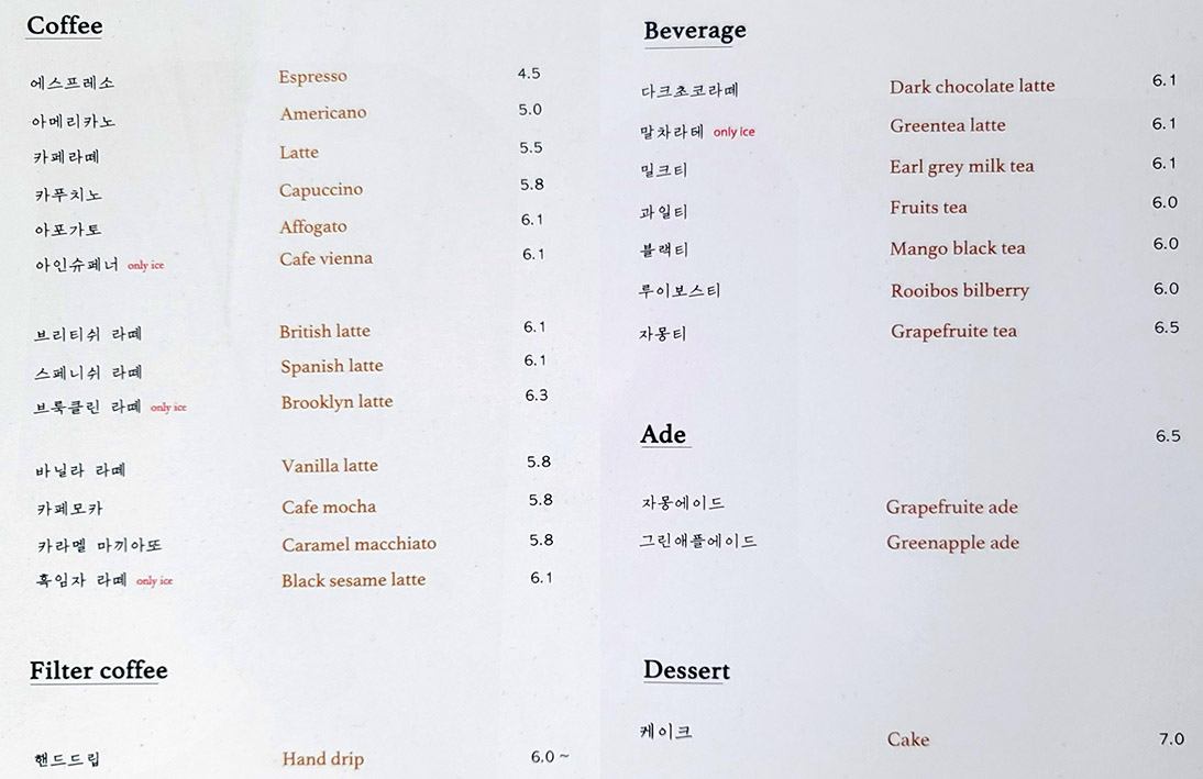 메뉴는 대충 이렇습니다. 앞에 붙여진 메뉴에는 거진 음료 메뉴만 있었어요. 커피 사이즈는 별도로 없습니다